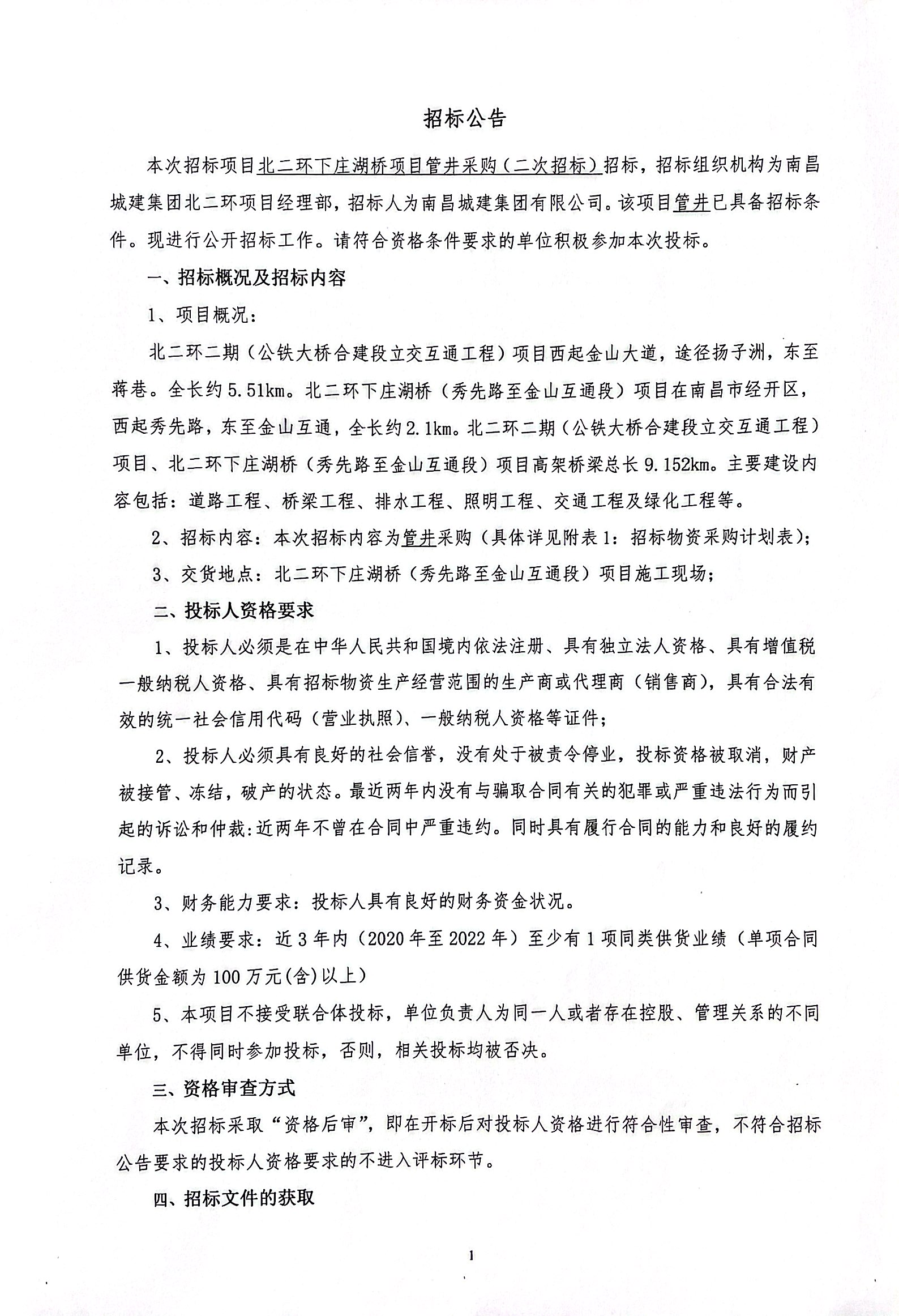 本次招标项目北二环下庄湖桥项目管井采购(二次招标)招标,招标组织机构为ok138cn太阳集团集团北二环项目经理部,招标人为ok138cn太阳集团集团有限公司。该项目管井已具备招标条件。现进行公开招标工作。请符合资格条件要求的单位积极参加本次投标。