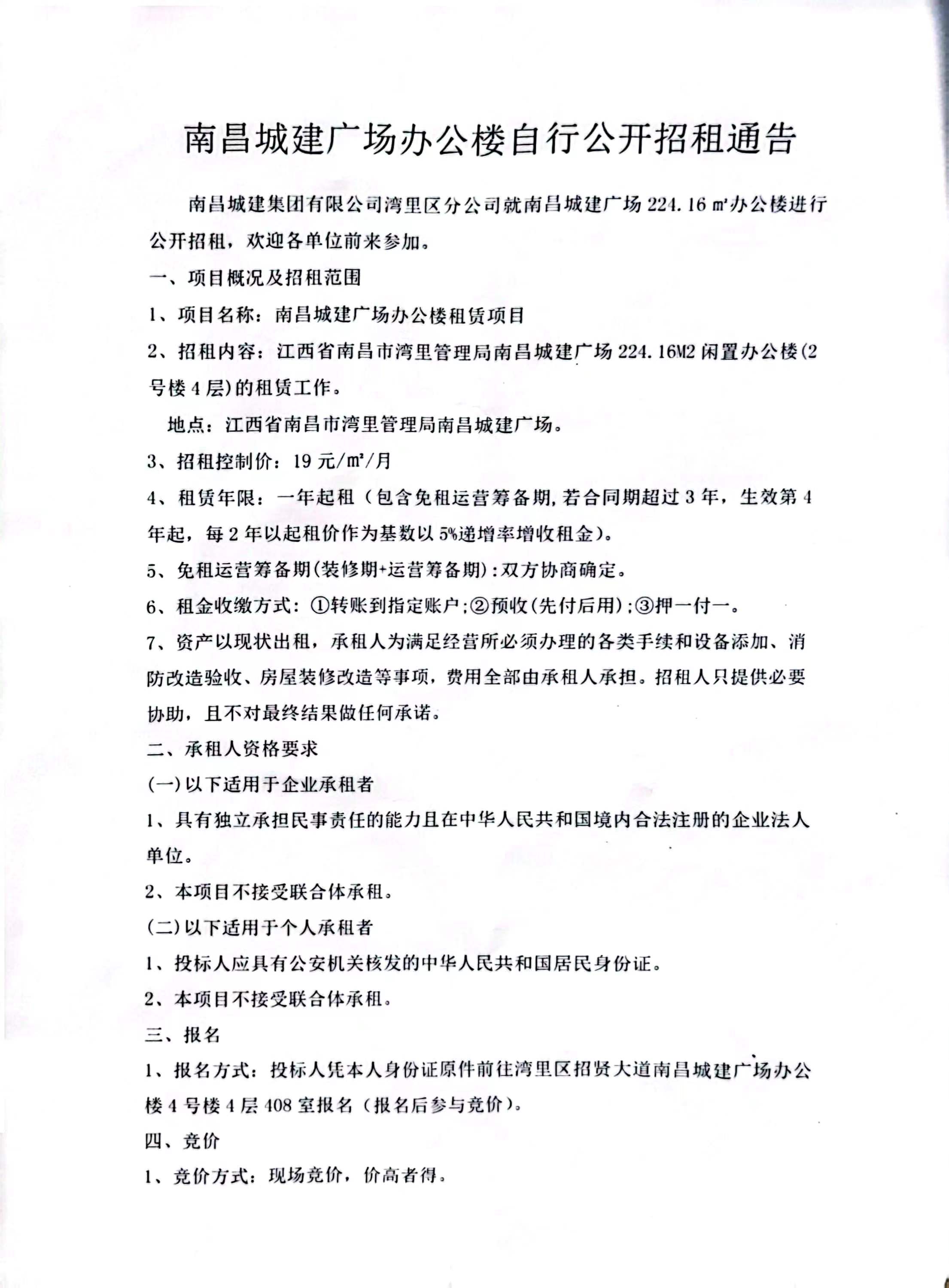 2、招租内容:江西省南昌市湾里管理局ok138cn太阳集团广场224.16M2闲置办公楼(2号楼4层)的租赁工作。