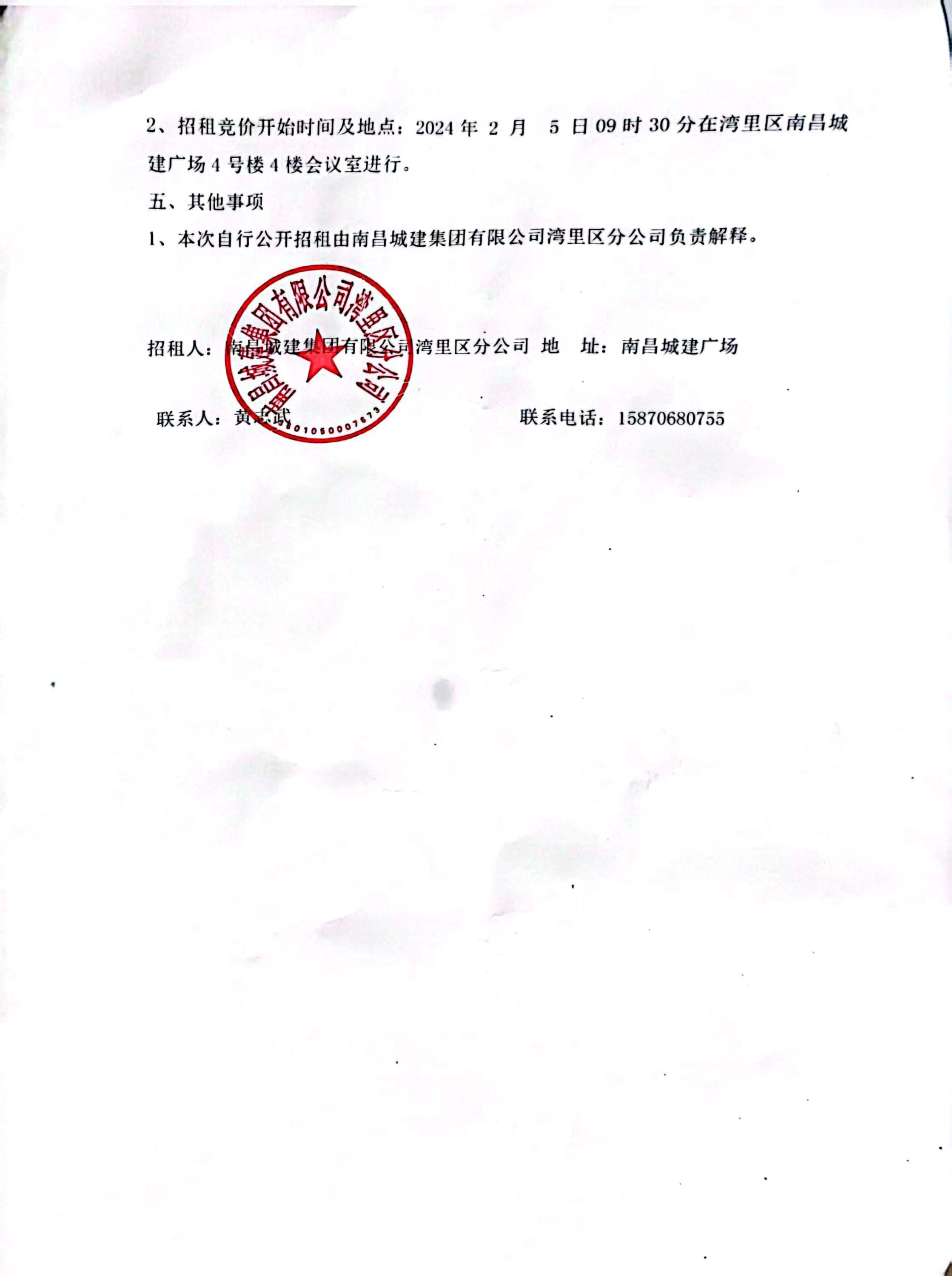 2、招租竞价开始时间及地点:2024年 2 月 5 日09时30分在湾里区ok138cn太阳集团广场4号楼4楼会议室进行。