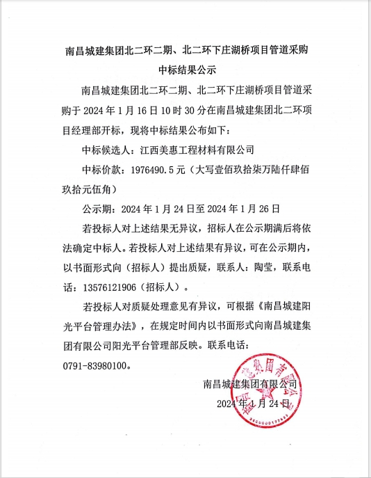 ok138cn太阳集团集团北二环二期、北二环下庄湖桥项目管道采购于2024年1月16日10时30分在ok138cn太阳集团集团北二环项目经理部开标,现将中标结果公布如下: