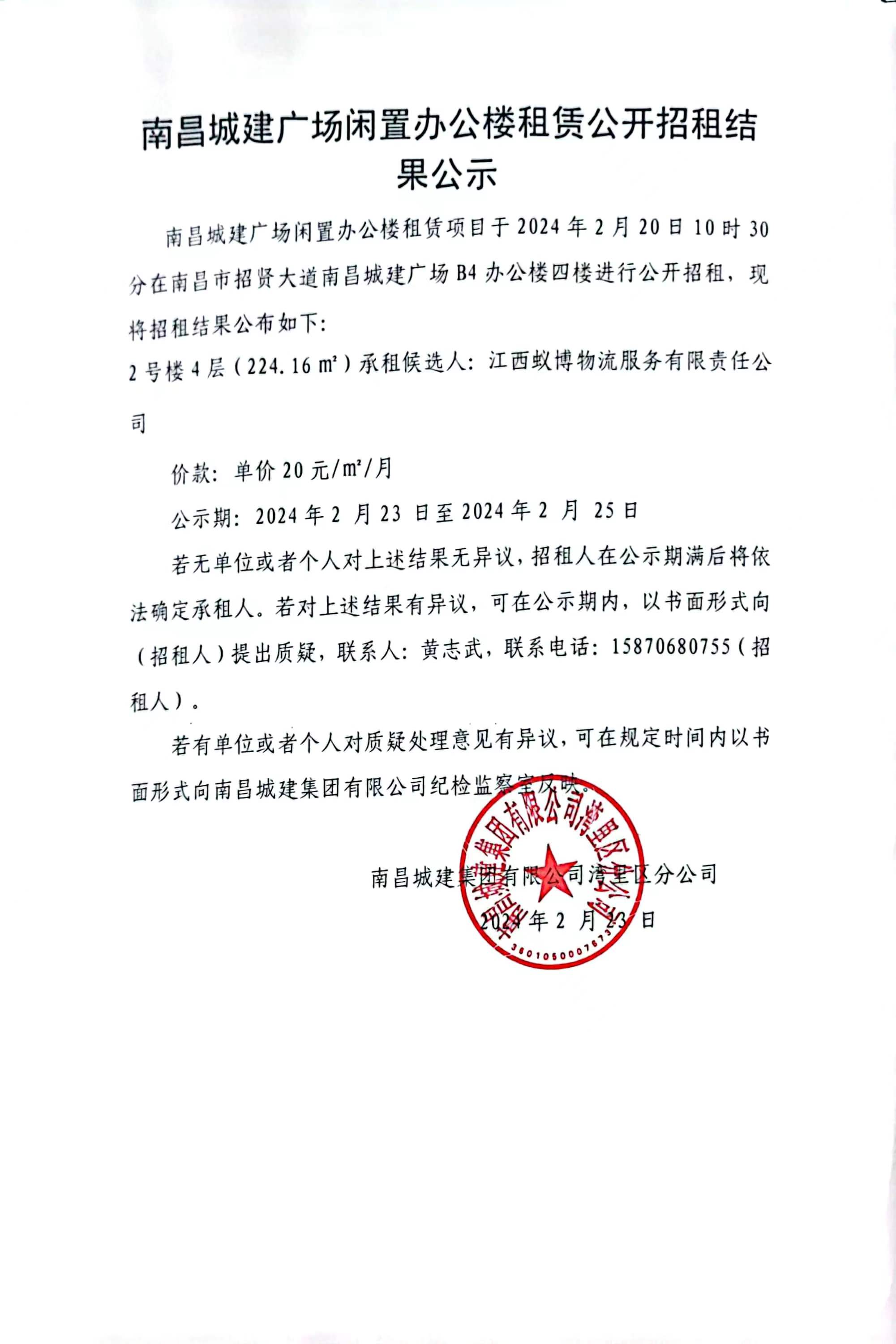 ok138cn太阳集团广场闲置办公楼租赁项目于2024年2月20日10时30分在南昌市招贤大道ok138cn太阳集团广场B4办公楼四楼进行公开招租,现将招租结果公布如下: