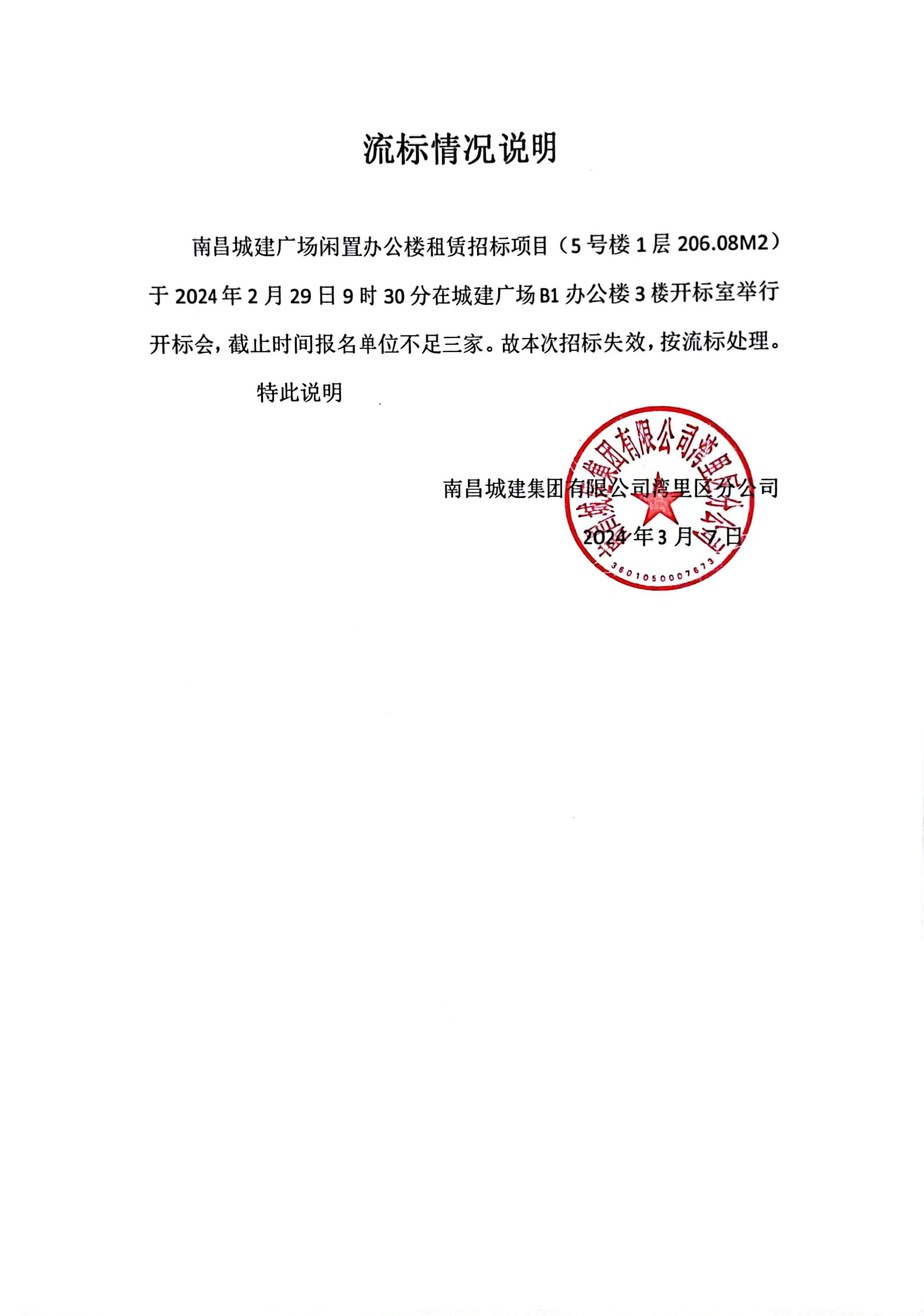 ok138cn太阳集团广场闲置办公楼租赁招标项目(5号楼1层206.08M2)于2024年2月29日9时30分在城建广场B1办公楼3楼开标室举行开标会,截止时间报名单位不足三家。故本次招标失效,按流标处理。